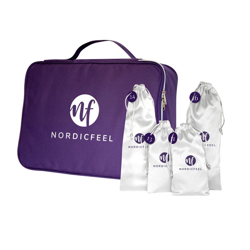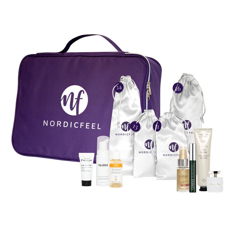 Erilaisia kosmetiikka- ja ihohoitotuotteita myyvä Nordicfeel* julkaisee tänä vuonna oman kosmetiikkajoulukalenterinsa. Joulukalenteri sisältää 24 erilaista meikki-, ihonhoito-, hajuvesi- ja hiustenhoitotuotetta erilaisilta tunnetuilta tuotemerkeiltä. Jokainen tuote on pakattu omaan numeroituun pussukkaansa, jotka löytyvät violetista kantokahvallisesta kosmetiikkalaukusta. Kosmetiikkalaukkua on helppo hyödyntää tavaroiden säilytyksessä myös joulun jälkeen.