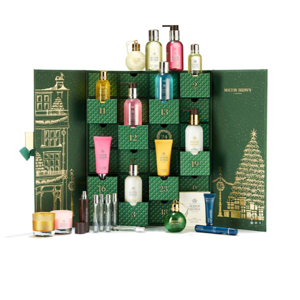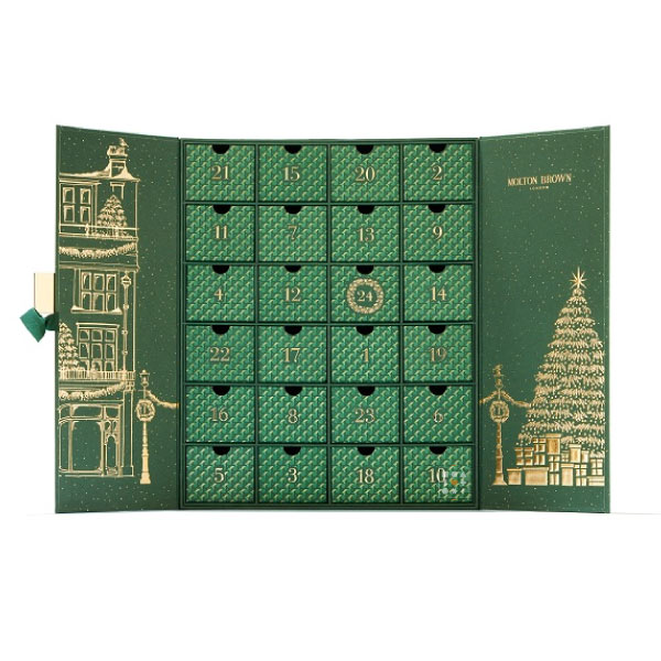 Molton Brownin tämän vuoden kosmetiikkajoulukalenteri on upean tummanvihreä kultaisin kuvioinnein. Joulukalenterin ulkonäkö on kuvittaja Rebecca Williamsin käsialaa ja kuvaa Molton Brownin alkuperäisen Lontoon liikkeen jouluista ulkoasua. Joulukalenteri sisältää 24 Molton Brownin omaa tuotetta. Kalenterin tuotteet ovat vegaanisia, gluteenittomia, pähkinättömiä, parabeenittomia ja ftalaatittomia, minkä lisäksi ne eivät sisällä mitään eläinperäisiä ainesosia.