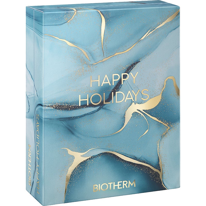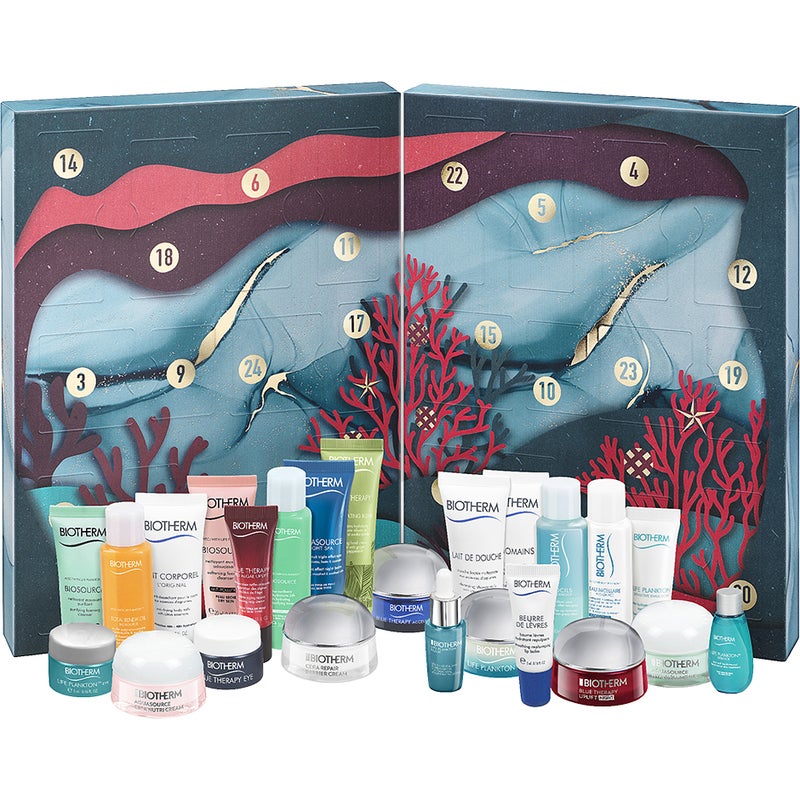 Biothermin tämän vuoden kosmetiikkajoulukalenteri on ulkopuolelta vaaleansininen kultaisilla koristeilla. Joulukalenteri aukeaa keskeltä kuin kirja paljastaen 24 repäisyluukkua, jotka kukin sisältävät yhden Biothermin ihonhoitotuotteen.