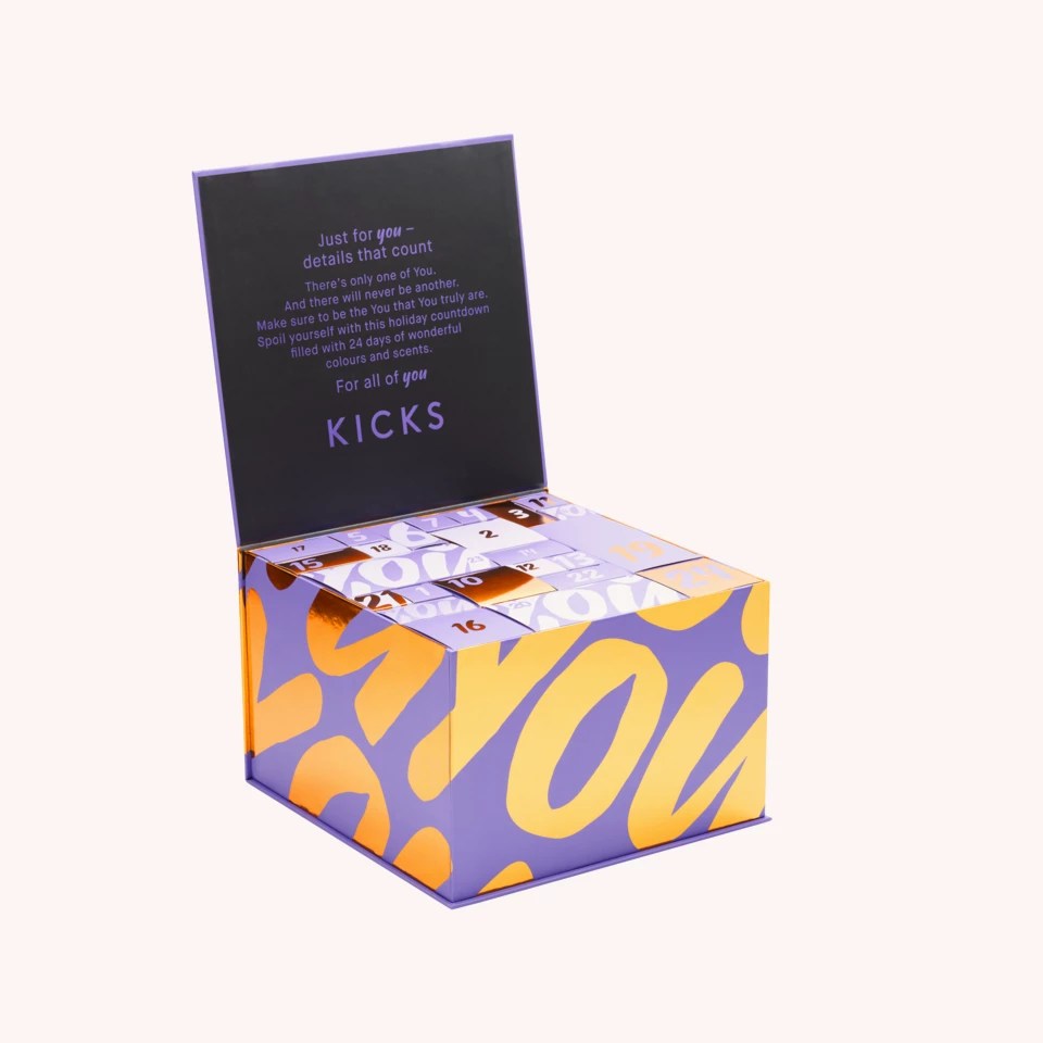 Kicks on julkaissut viime vuoden tapaan oman joulukalenterin sekä meikkituotteille että ihonhoitotuotteille. Tämän vuoden meikkijoulukalenteri on iloisen violetin ja kullan sävyinen. Tuotteet on pakattu laatikkoon nostettavan kannen alle yksittäisiin, numeroituihin pahvirasioihin.