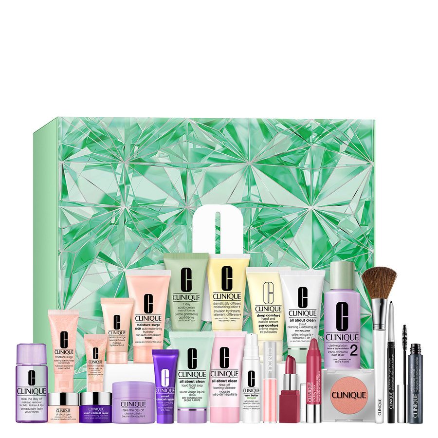 Cliniquen joulukalenteri on tänä vuonna vihreä ja sisältää perinteiset repäisyluukut, joiden takaa paljastuu 24 Cliniquen omaa ihonhoito- ja meikkituotetta.